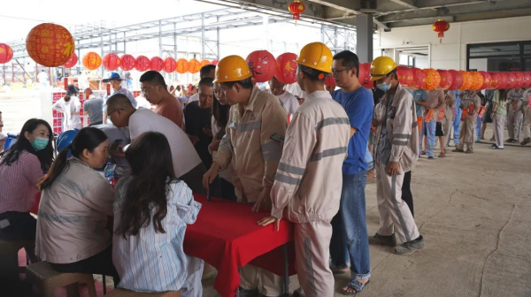 元宵佳節(jié),莫羅瓦利產(chǎn)業(yè)基地食堂門前張燈結(jié)彩,160張燈謎紙條整齊劃一地懸掛在燈籠下面。來自基地各個部門的中印尼員工互相探討燈謎謎底。微風(fēng)吹來,謎面隨風(fēng)起舞,兩國員工穿梭其間,流連忘返。猜謎結(jié)束后,大家紛紛入座食堂,共享元宵。