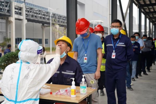 與此同時,基地嚴格要求進入廠區(qū)人員全天佩戴口罩、接受體溫檢測、兩碼核對,積極與政府部門對接,在公司設(shè)立核酸檢測點,每日組織全員核酸檢測工作,確保防疫、生產(chǎn)兩不誤。在這場沒有硝煙的疫情防控阻擊戰(zhàn)中,南部產(chǎn)業(yè)基地涌現(xiàn)出了一批奮戰(zhàn)在抗疫一線的“逆行者”,這支由公司黨員組成的志愿先鋒隊主動請纓,協(xié)助醫(yī)務人員完成核酸檢測信息錄入等相關(guān)工作。在9天的時間里,他們奮戰(zhàn)在核酸檢測一線,每天輔助核酸檢測4000余人/次,憑借積極主動、細致熱忱、調(diào)度高效的服務,得到了醫(yī)護人員和全體員工的一致稱贊。